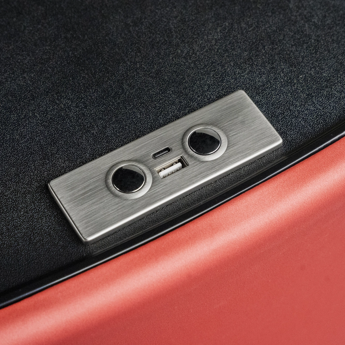 In het tafelblad zijn USB-A en USB-C aansluitingen geïntegreerd, ideaal om tijdens gesprekken je telefoon of tablet op te laden zonder extra opladers op de balie te hoeven leggen. Dit maakt de presentatiebalie niet alleen een opvallend brandingelement, maar ook een praktisch werkstation tijdens drukke beursdagen en events.