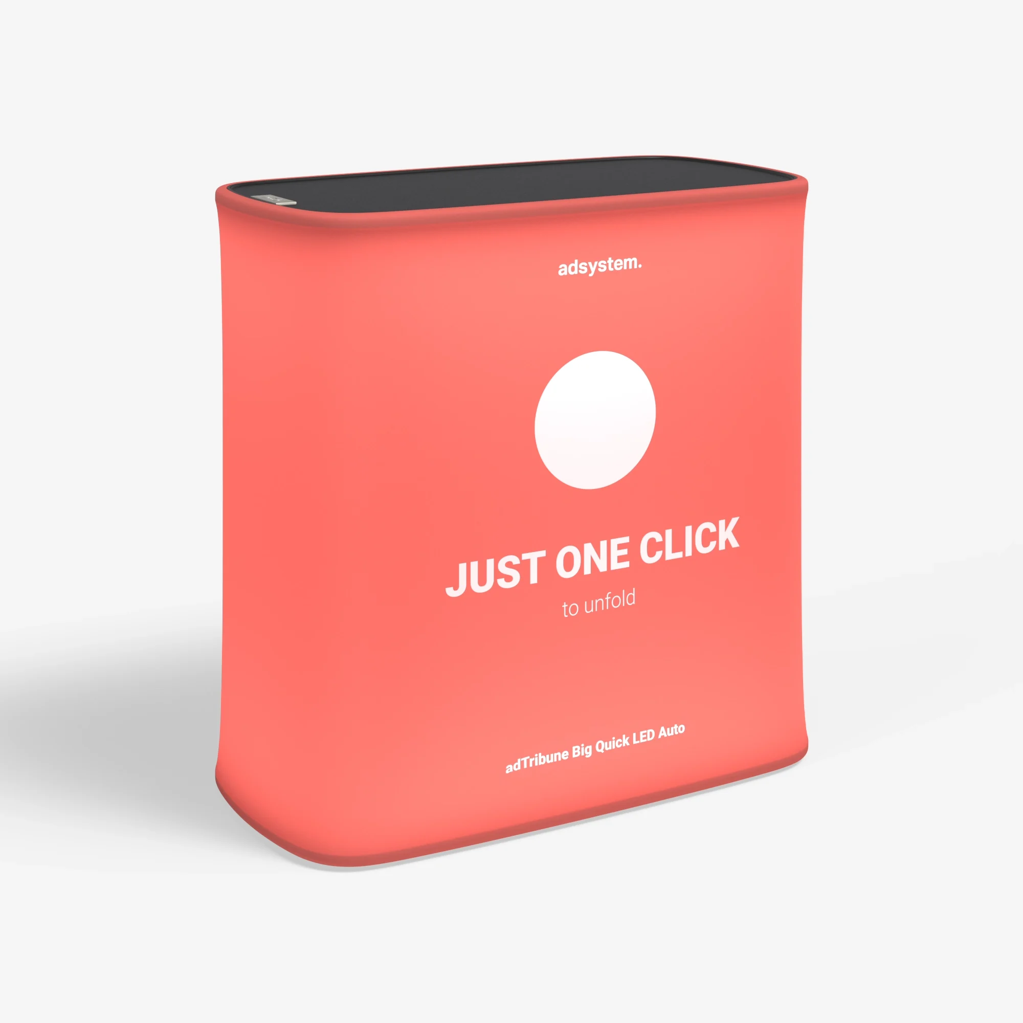 Het unieke aan deze beursbalie is het automatische, pneumatische frame dat zich in enkele seconden uitschuift. Met twee knoppen, subtiel verwerkt in het tafelblad, klapt de constructie zichzelf uit en weer in, volledig zonder gereedschap of losse onderdelen, zodat je zonder montagekennis razendsnel klaar bent voor je presentatie.