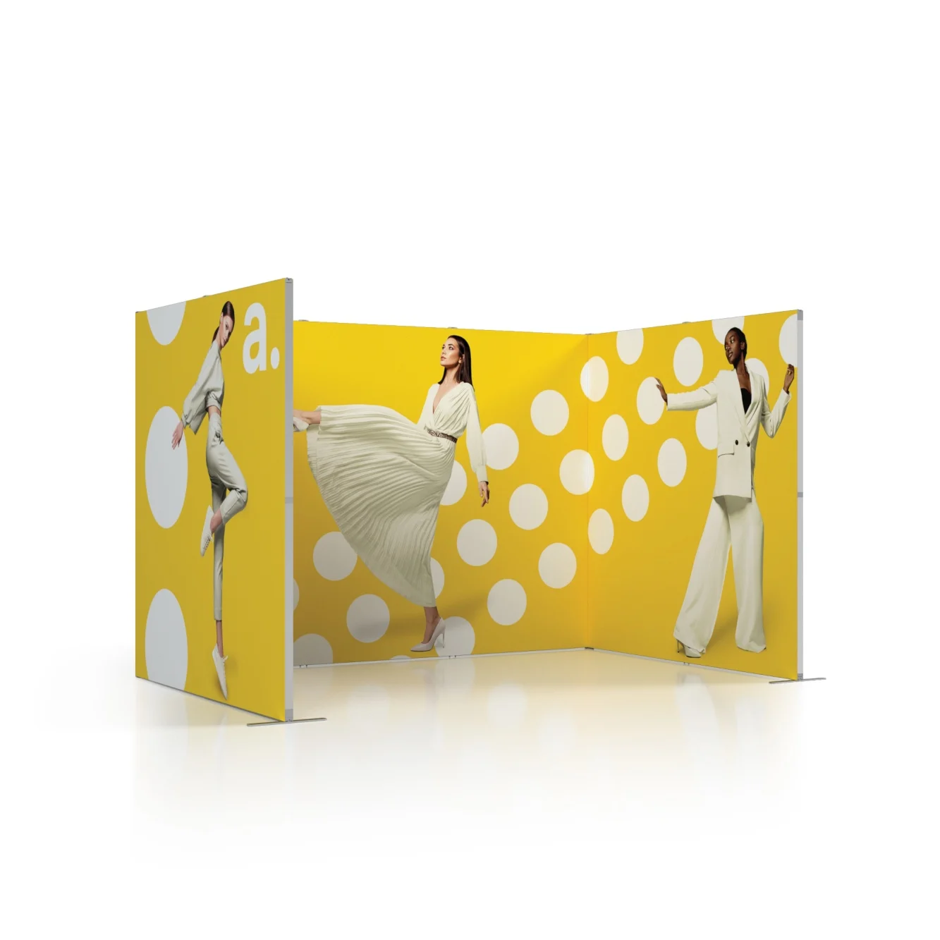 De textieldoeken worden bedrukt met sublimatietechniek, wat zorgt voor levendige kleuren en scherpe details. Dankzij het Silicon Edge System (SEG) span je de doeken strak en verwissel je deze snel, zodat je je beurswand makkelijk kunt vernieuwen of aanpassen.