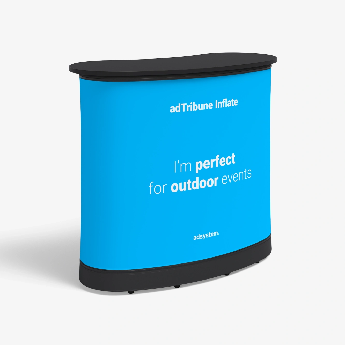 De adTribune Inflate biedt een groot werkblad voor brochures, samples of een laptop, waardoor je een overzichtelijke presentatiebalie creëert. Aan de binnenzijde bevinden zich twee stoffen legplanken waarin je extra materiaal en persoonlijke spullen netjes uit het zicht kunt opbergen.