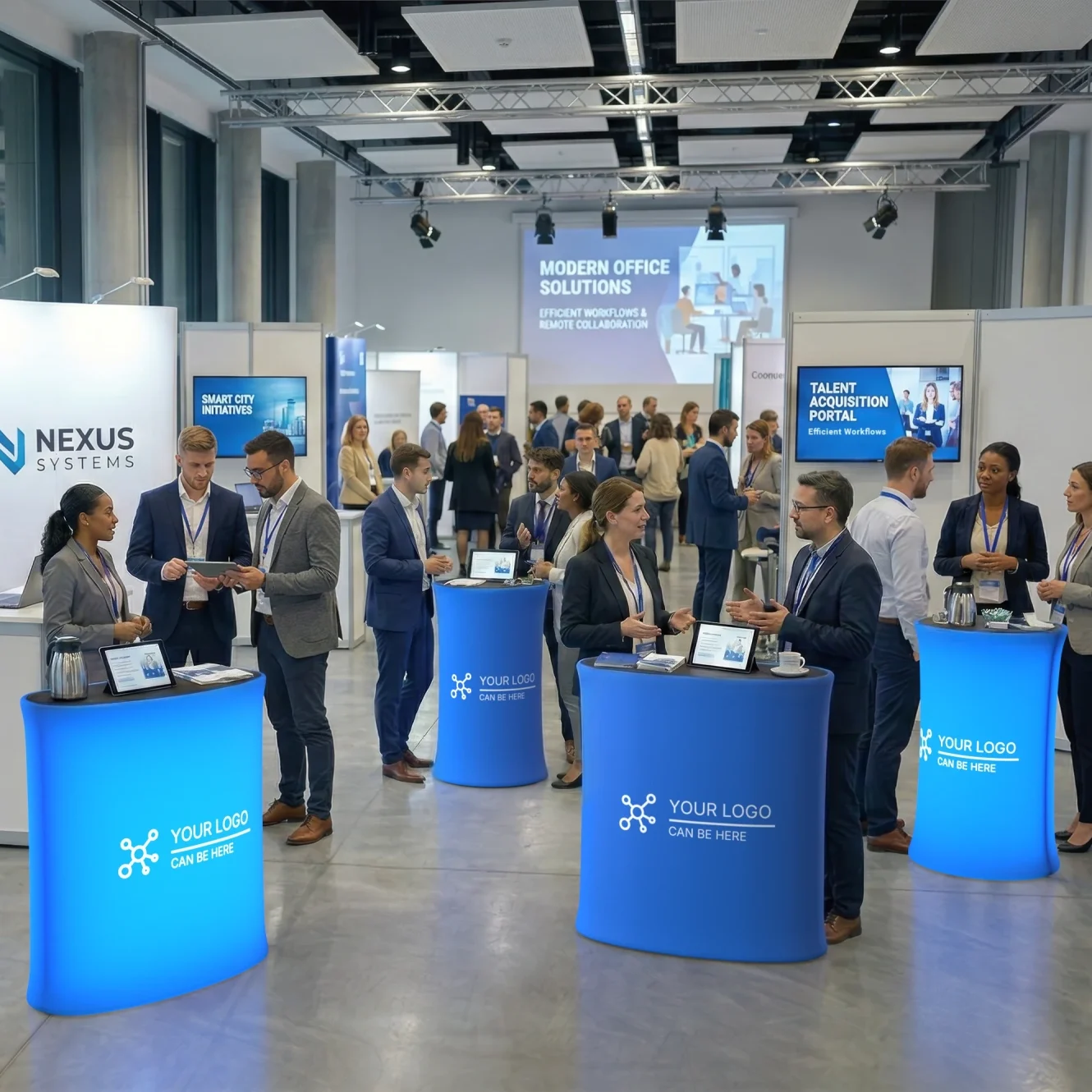 Dankzij de ergonomische hoogte is deze balie ook prima inzetbaar als statafel bij gesprekken, inschrijvingen of demo’s. Een statafel bedrukken in jouw huisstijl maakt van deze ronde balie een herkenbaar en uitnodigend onderdeel van elke beurs of promotieactie.