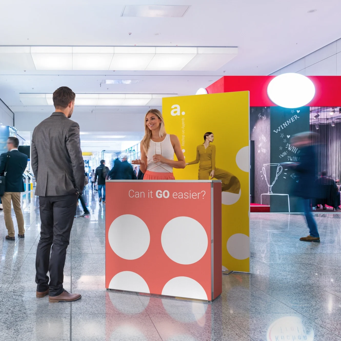 The combination of the exhibition wall and the counter creates a complete and cohesive booth. The textile wall functions as an impressive backdrop, while the counter provides a practical place for conversations and presenting materials. This creates an orderly and inviting space that immediately attracts attention. - Easy and intuitive operation