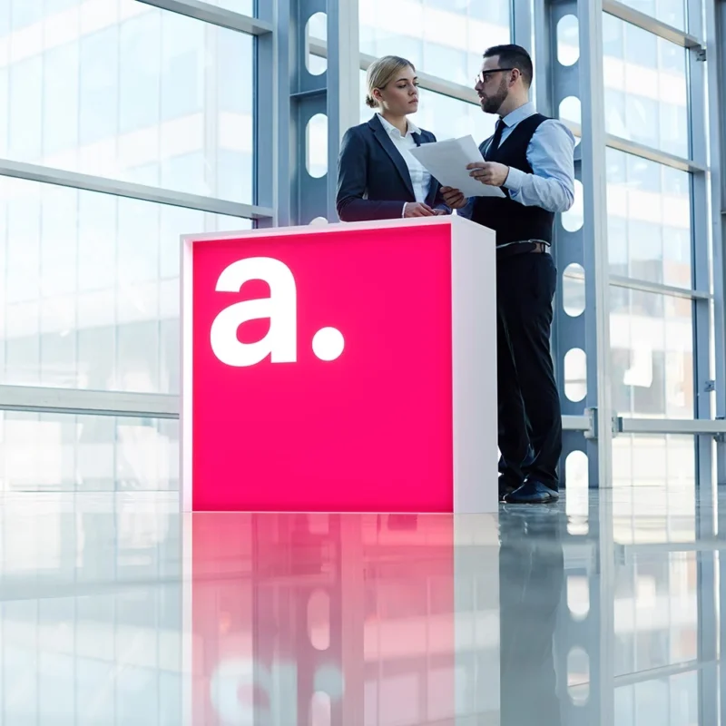 De balie is voorzien van een direct verlicht LED-gordijn dat de textielprint met je graphics over het gehele oppervlak verlicht, waardoor de balie een professionele uitstraling krijgt. Bovendien kan de textielprint los worden besteld en eenvoudig vervangen, waardoor je snel kunt wisselen in je reclameboodschap.
