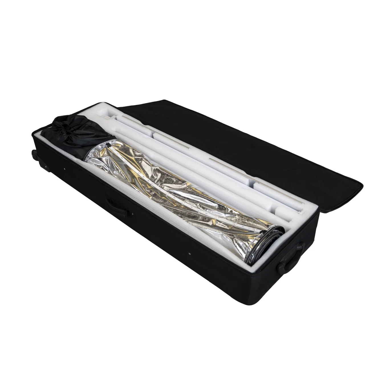 De verlichte beurswand wordt geleverd met een transporttas met wieltjes, wat verplaatsen en opslag makkelijk maakt. Het frame wordt snel opgebouwd zonder gereedschap, terwijl het Silicon Edge System (SEG) zorgt voor een snelle en eenvoudige wissel van het doek. Zo blijf je flexibel in je promotie.