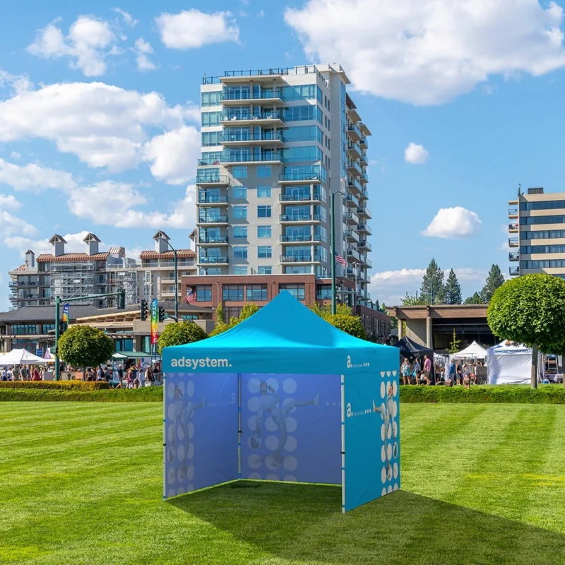 De adTent Express reclame tent is volledig te bedrukken met je eigen logo, bedrijfsnaam of merkuitingen. Met hoogwaardige sublimatieprints op het waterdichte textiel blijven de kleuren levendig en beschermd tegen vocht en UV-stralen. Zo heb je een opvallend, professioneel promotiemiddel dat op festivals, beurzen, sportevenementen en andere promotionele activiteiten perfect tot zijn recht komt.